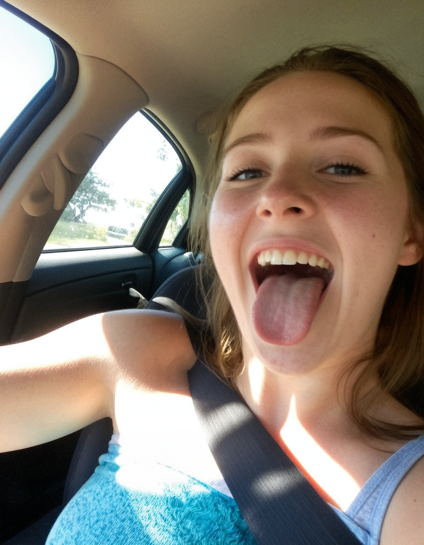Authentic share, Spontaneous, authentic, natural light: Car selfie. Person in driver's seat, light coming through windshield. Seatbelt visible, dashboard and steering wheel in frame. Subject possibly caught mid-laugh or making a face.