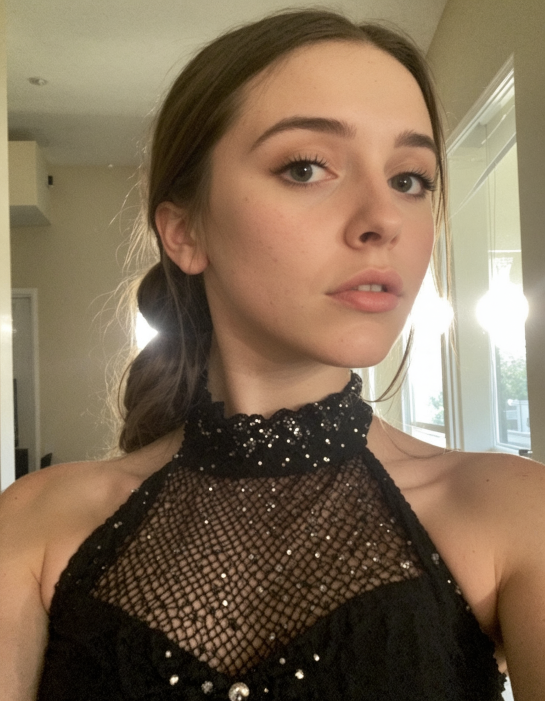 instagram photo, front view, portrait photo of a 24 y.o woman, wearing dress, beautiful face, cinematic shot