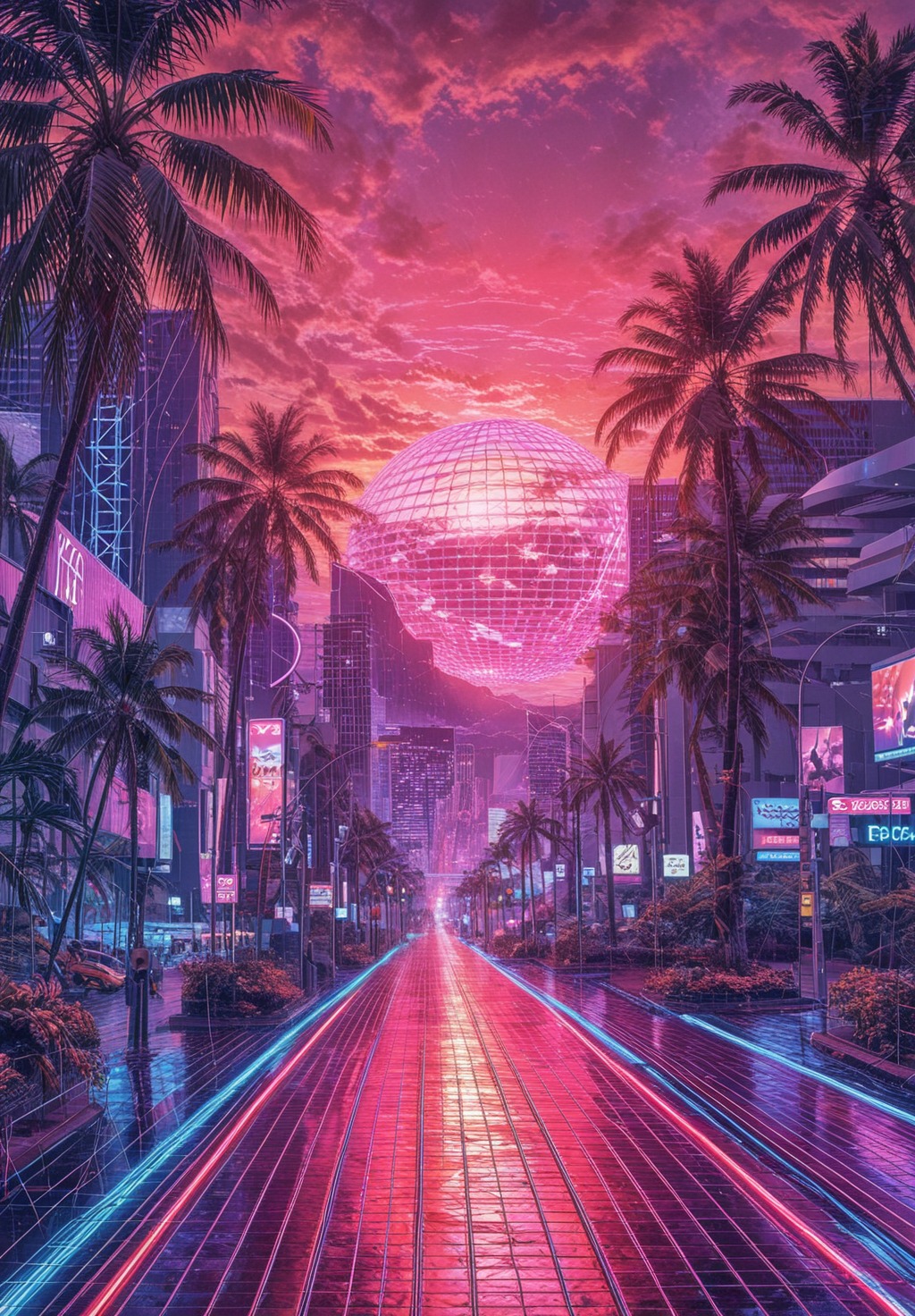 Retro-futuristic 80s synthwave aesthetic, neon grid, cyber city, palm trees, sunset <lora:digital-scenery-v5:1>