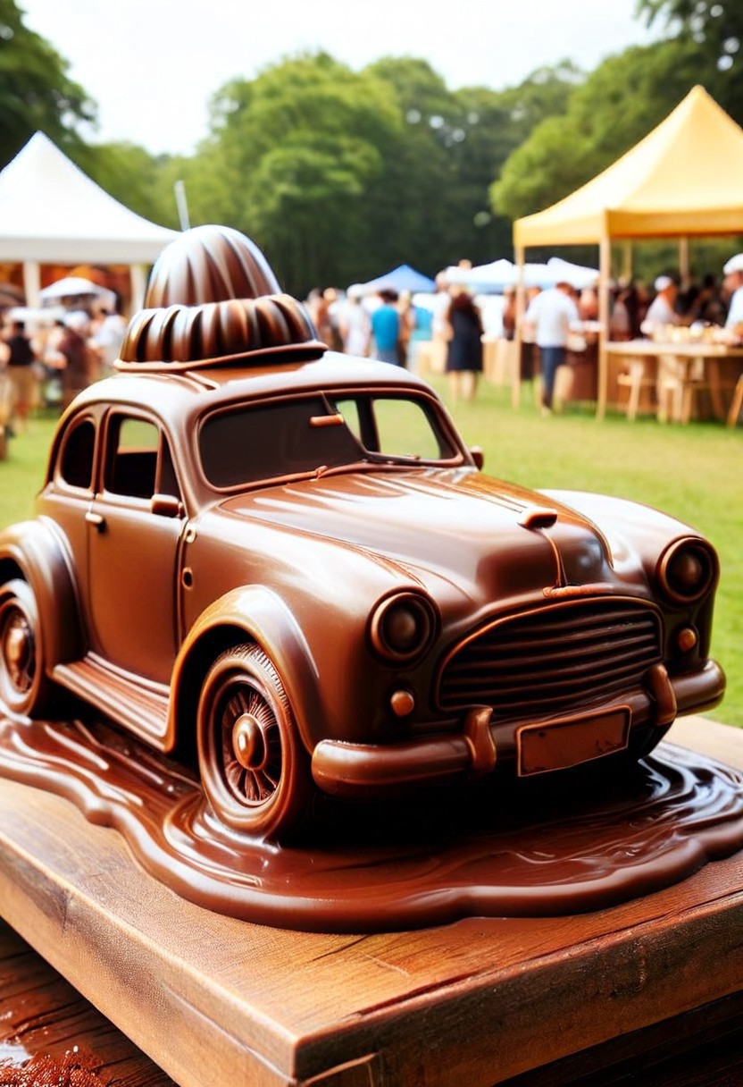 A highly detailed chocolate sculpture of a classic car, showcased at an outdoor event on a hot summer day. The car is starting to melt, with the body warping and the wheels turning into gooey puddles of chocolate. The artist, wearing a chef’s hat, is frantically trying to save the sculpture by blowing on it with a small fan, while a crowd of onlookers laughs and snaps photos. In the background, there’s a lively summer fair with colorful tents, balloons, and a banner that reads 'Chocolate Art Festival.'