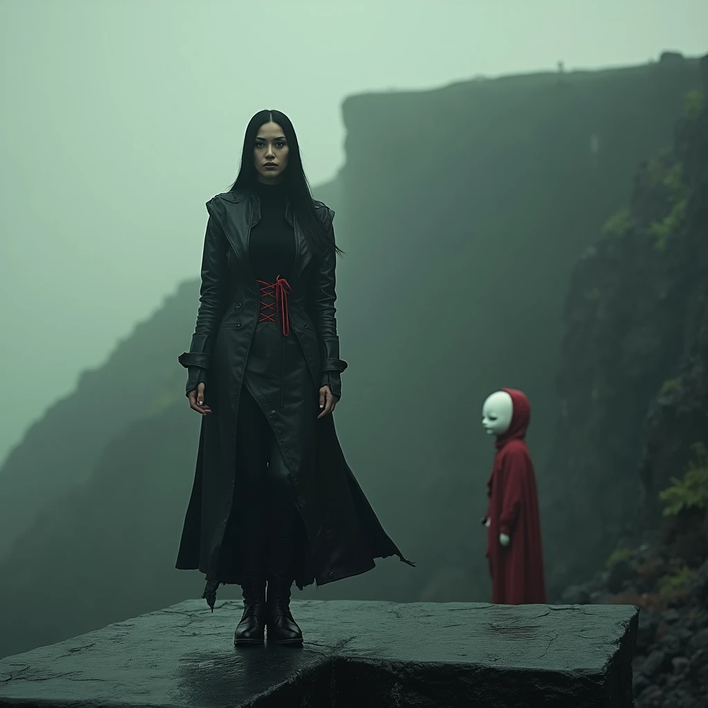 most insane ultra real photo, nonconformism grainy, in the foreground, a full-length figure on a black stone ledge, a woman with long black hair flowing, a black turtleneck with a high collar, a long leather cloak with red lacing, boots,. in the background, a cliff,. in the foreground, background a strange doll with a large white head faceless, red robe, stands on a black stone ledge in the fog, lava flows, dark green sky, not obvious, unexpected perspective