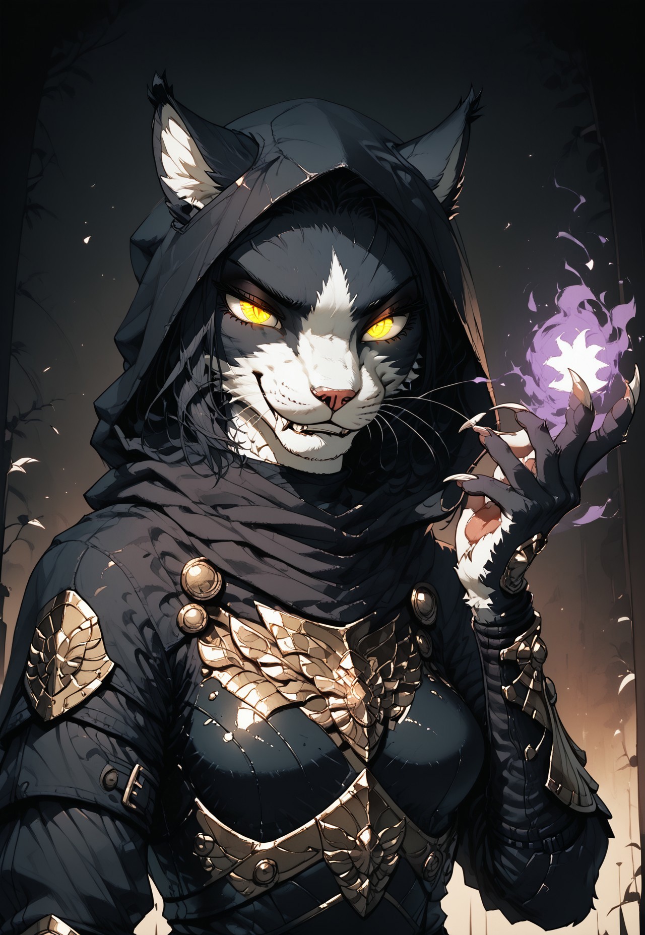 sinozick style, flat color, dark theme, score_9, score_8_up, score_7_up, masterpiece, best quality, absurdres, vibrant, highly detailed, very aesthetic, (high contrast, sidelightning), beautiful, 1girl, solo, Ember (ESO), Black Armor, Hood, Feline, Furry, Anthro, black and white fur, glowing yellow eyes, smirk, hand up, sharp nails, purple magic