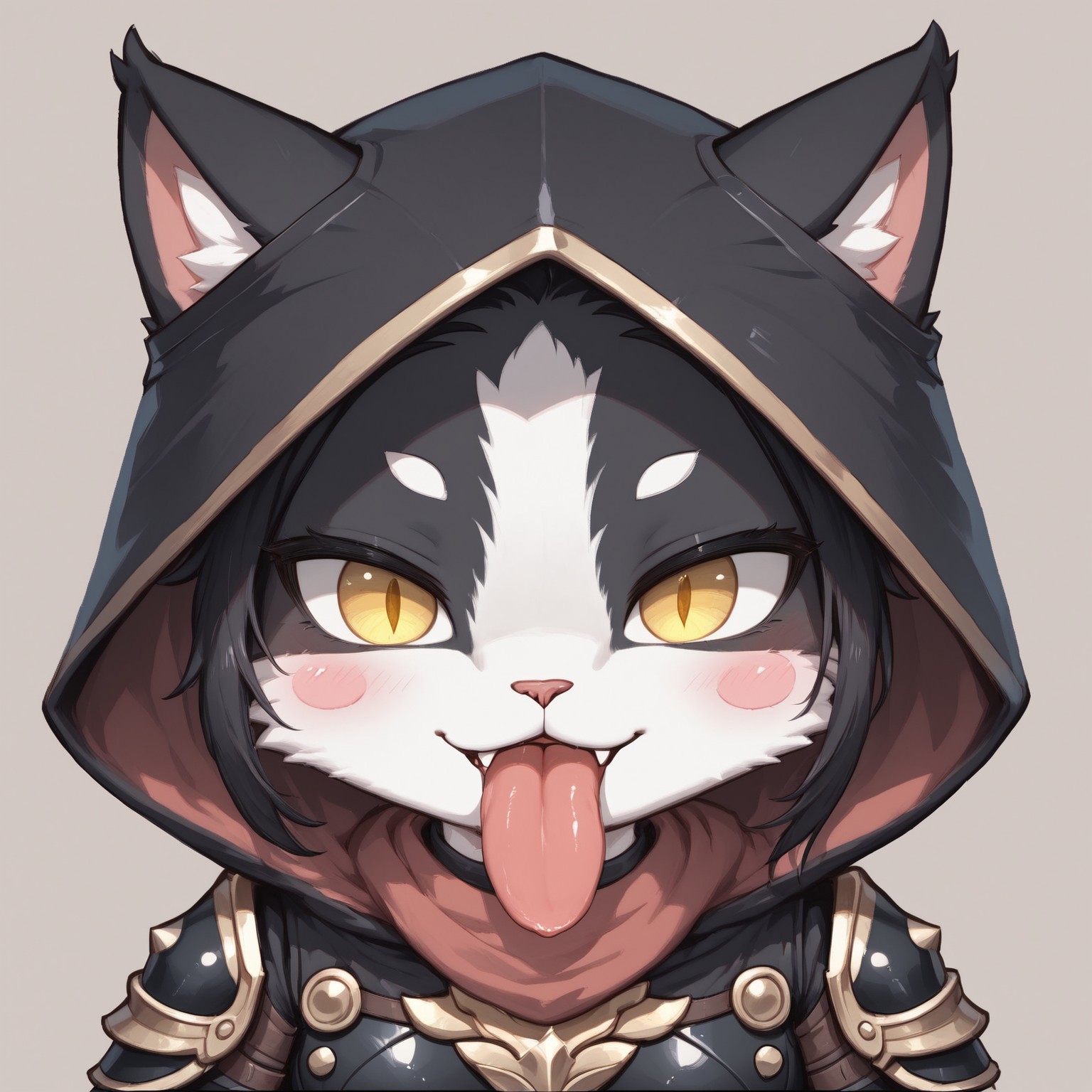 score_9, score_8_up, score_7_up, masterpiece, best quality, absurdres, vibrant, highly detailed, very aesthetic, blush_sticker, licking screen, looking at viewer, simple background, tongue, tongue out, chibi, :3, Ember (ESO), Black Armor, Hood, Feline, Furry, Anthro, black and white fur, yellow eyes