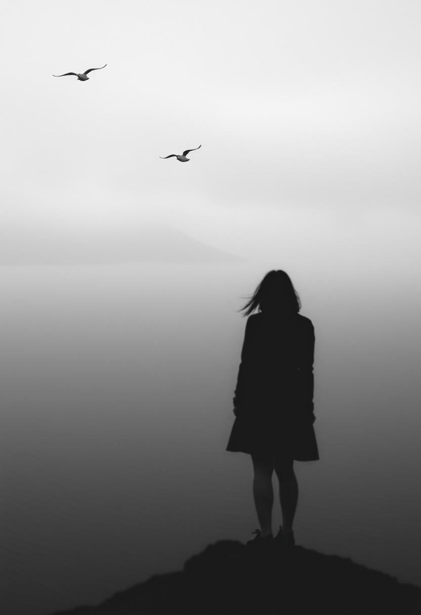 silhouetted girl backview in middle in close up of the frame, windy, huge vast deep ocean below, she is standing on the silhouetted cliff in middle, motion blur, mountains in the background, birds flying over it, foggy weather, black and white, minimalist style, simple details, calm mood,photography, soft light, high resolution.his minimalist photograph embraces the timeless allure of vintage kodak colors lighting atmosphere, high exposure, retro film gradual blur, wide angle, cinematic shot. Negative space,