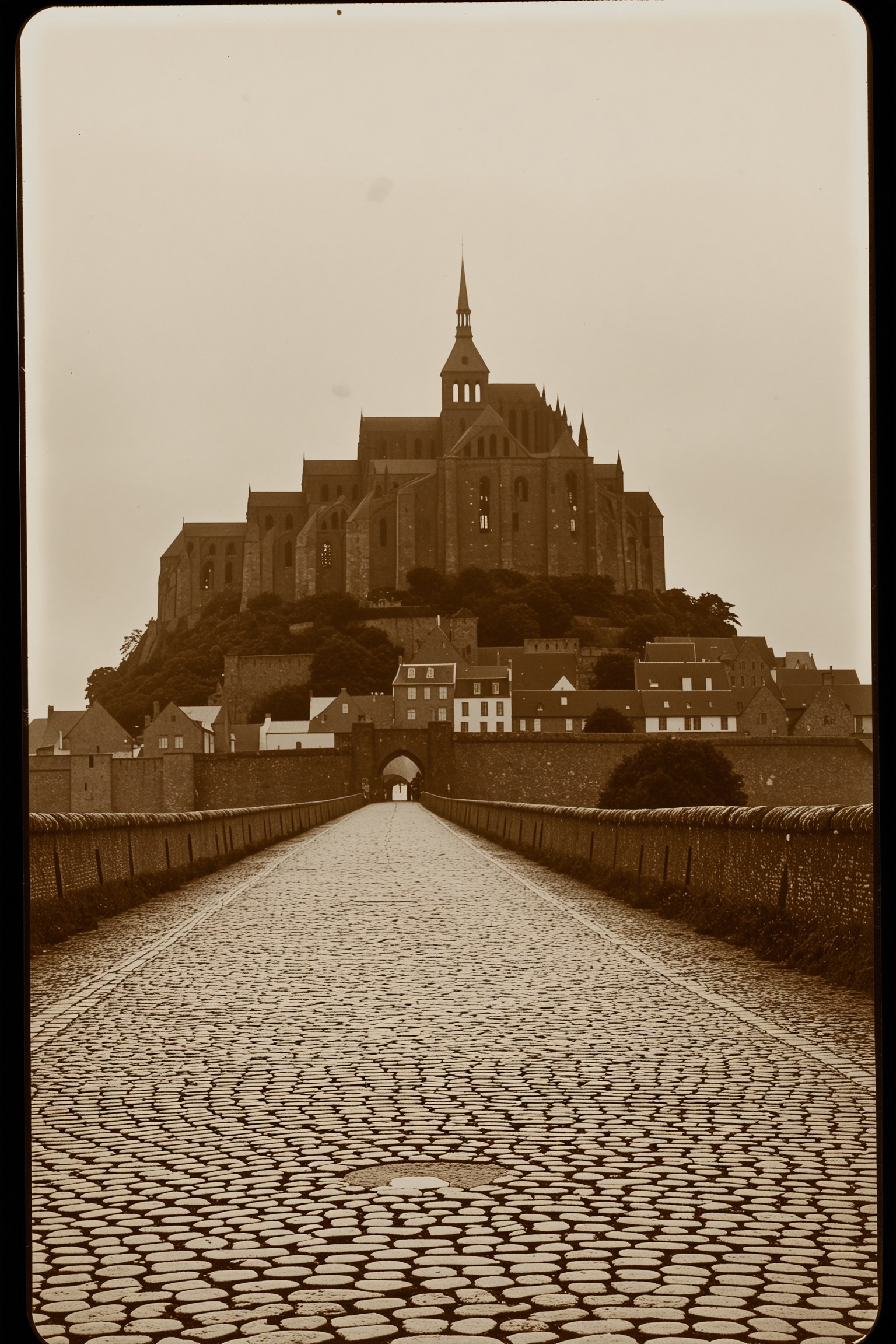 A vintage black-and-white photograph of Mont Saint-Michel, taken in the early 1900s. The scene features soft film grain, slight sepia toning, and natural wear and tear for an authentic aged look. The towering abbey stands against a misty sky, with cobblestone streets and old-world charm. Depth-enhanced diffusion ensures spatial consistency, and the composition captures the timeless beauty of the historic island.