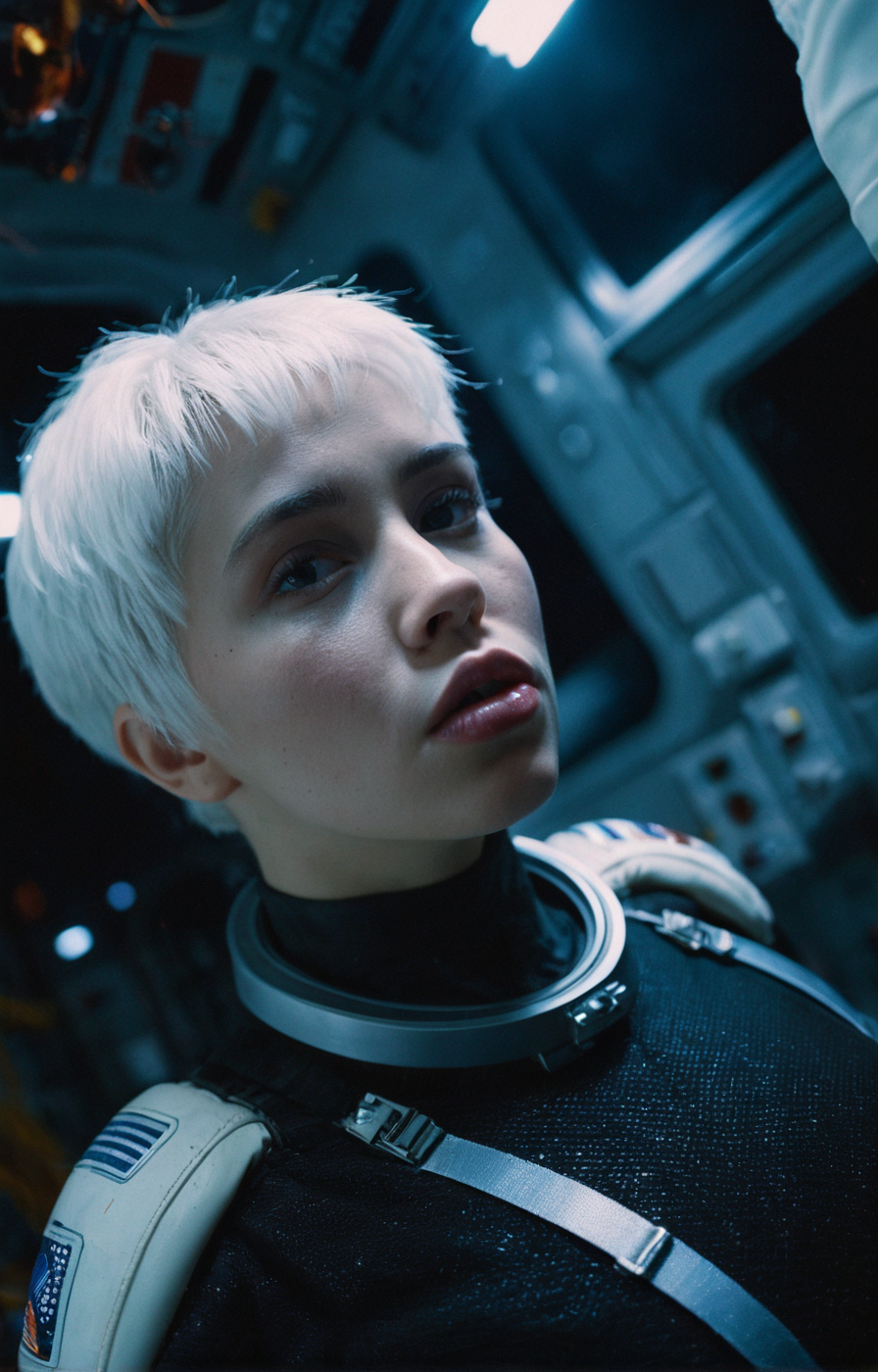 masterpiece, 25 yo 1girl, white short hair, dressed in a black space suit, stands on the space station, intricate details, highly-detailed, hyper-realistic, 8k RAW Editorial Photo, close up, portrait, (analog photo:1.2),(art retouch, analog photo),((dynamic pose:1.2),(dynamic camera),(amateur photo:1.3,art retouch,, analog photo), (close-up),(many details themed complex background:1.3),(skin texture)),(midnight hour, high quality, film grain), (natural colors, correct white balance, color correction, dehaze,clarity), (natural colors, correct white balance, color correction, dehaze,clarity), Lomography Color Negative 400.3), (thick lips:1.3), cinematic light, dramatic light, shallow depth of field, high budget, bokeh, cinemascope, film grain