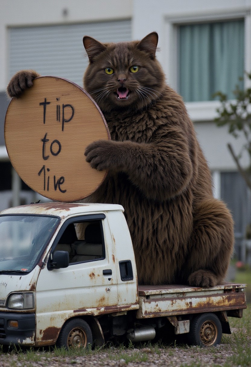 a strange photo of, a huge cat monster crouching and holding a huge round wooden board with "tip to live", a broken rusty white keitora car with small six wheels. a fuzzy effect delivering some vibes.
