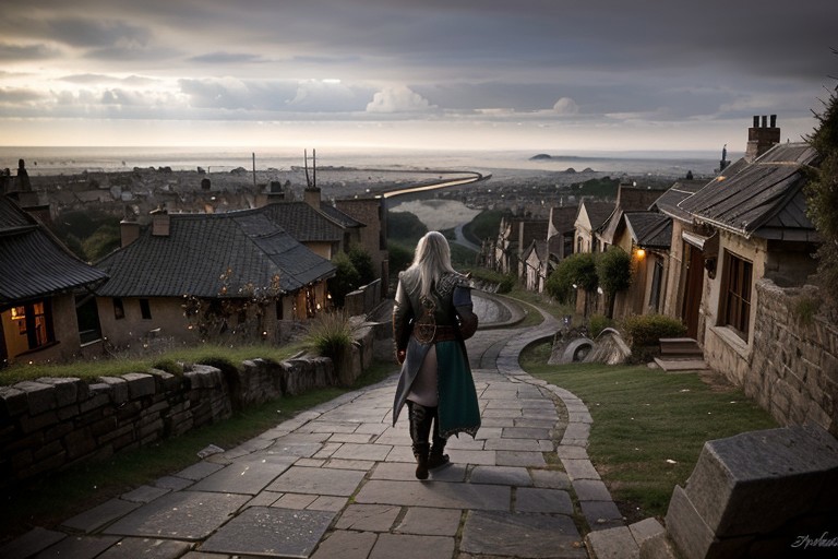 (Highly detailed, hyper-realistic, cinematic, 8K, ultra HD, dramatic lighting, fantasy art, photorealistic, masterpiece, intricate details) A badly beaten and bruised male elf with long flowing transparent white hair with black streaks. His face is scarred with a deep gash on his forehead and upper cheek. His once majestic attire is now ripped and blood-stained. He stumbles down a cobblestone path, looking relieved as he gazes toward a distant, glowing coastal city. At each of his sides are two short swords sheathed in ornate black and silver scabbards, with only their ornate golden handles exposed. Green shimmering fireflies sparsely line the path, guiding him toward the city. The city in the background is built from white stone, with organic, flowing architecture illuminated by soft silver light from rooftops. Crystals throughout the city emanate a gentle white glow, while heavy shadows darken the streets. The night sky is filled with the vast Milky Way galaxy, suggesting this city once existed on Earth. The streets are empty, adding to the serene, mystical atmosphere. (Cinematic composition, moody lighting, soft glow, atmospheric fog, epic fantasy setting, volumetric light, hyper-detailed environment, intricate textures, dramatic shadows, ultra-sharp focus, depth of field, stunning visual aesthetics, highly immersive scene, award-winning fantasy art style).