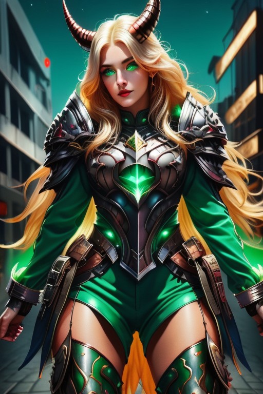 DonM3lv3s, Steffi_MXAI, AF_AngelLegion_SaintOfOrleans, CyberpunkWorld, Photo, close-up, portrait, mature female, European, solo, 38 years old, night, green nebula, professional grade, hands hidden or out of view, long hair, white hair, blond hair, milfy, milf, facing viewer, red lips, gentle smile, bright blue eyes, (innocent_big_eyes:1.2), dynamic pose. single horn,long hair,blonde hair,red_eyes,breastplate,armor,shoulder armor,pauldrons,vambraces,long sleeves,greaves,armored boots, (boots:1.5), green pants, (green sun:1.2), green sky.