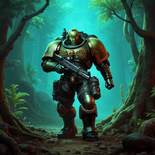 space marine vanguard, In the dense, alien forest, a Space Marine Vanguard advances with calculated precision. His Mark X Phobos Power Armour is adapted with adaptive camouflage, blending seamlessly with the bioluminescent flora. Equipped with a silenced bolt carbine and an Omni-Scrambler, he neutralizes enemy scouts and disrupts their communication lines. The ambient glow of the environment reflects off his armor as he navigates the undergrowth, embodying the epitome of stealth and lethality.