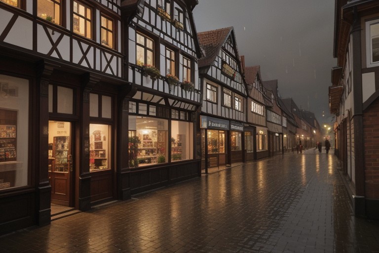 north german downtown, brick walls, red brick, aged brick, grey cobblestone, historic buildings, storefront, very detailed, dark night, heavy rain,
