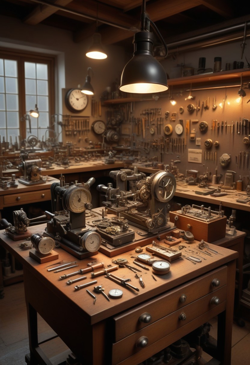hyper-realistic, award-winning, photo, highly detailed, photograph, an inside view of a , watchmaking workshop many old tools, materials, machines, warm lights, intricate details