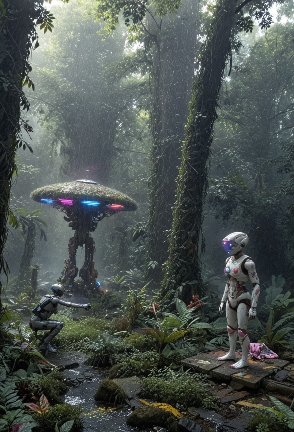 Surreal tropical rain forest dreamscape, floating islands of babylon civilization, darkwave radio portal, colorful cleaning robot watching a cyborg detective solving crimes in a cyberpunk world <lora:dark-experiment-fp8:0.57> <lora:retro-warm-colors-80s:0.45> <lora:retrotaylor:0.45> <lora:efturnal:0.43>