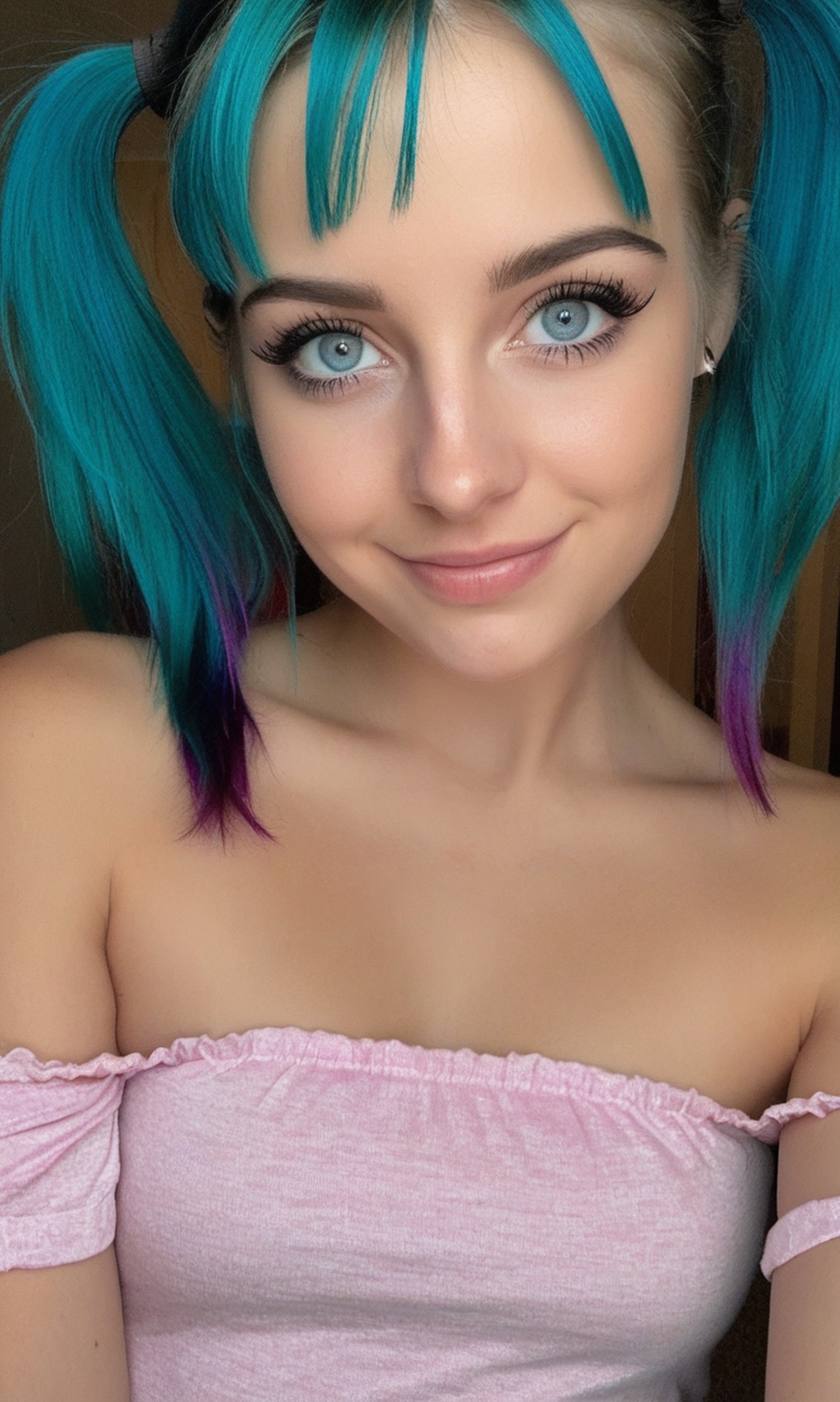 masterpiece, best quality, amazing quality, very aesthetic, high resolution, ultra-detailed, absurdres, 20yo woman, twintails, cyan and magenta heterochromia eyes, naughty face, closed smile, pink off-shoulder loose tube top, (cyan hair:1.1), flat chest, looking at viewer