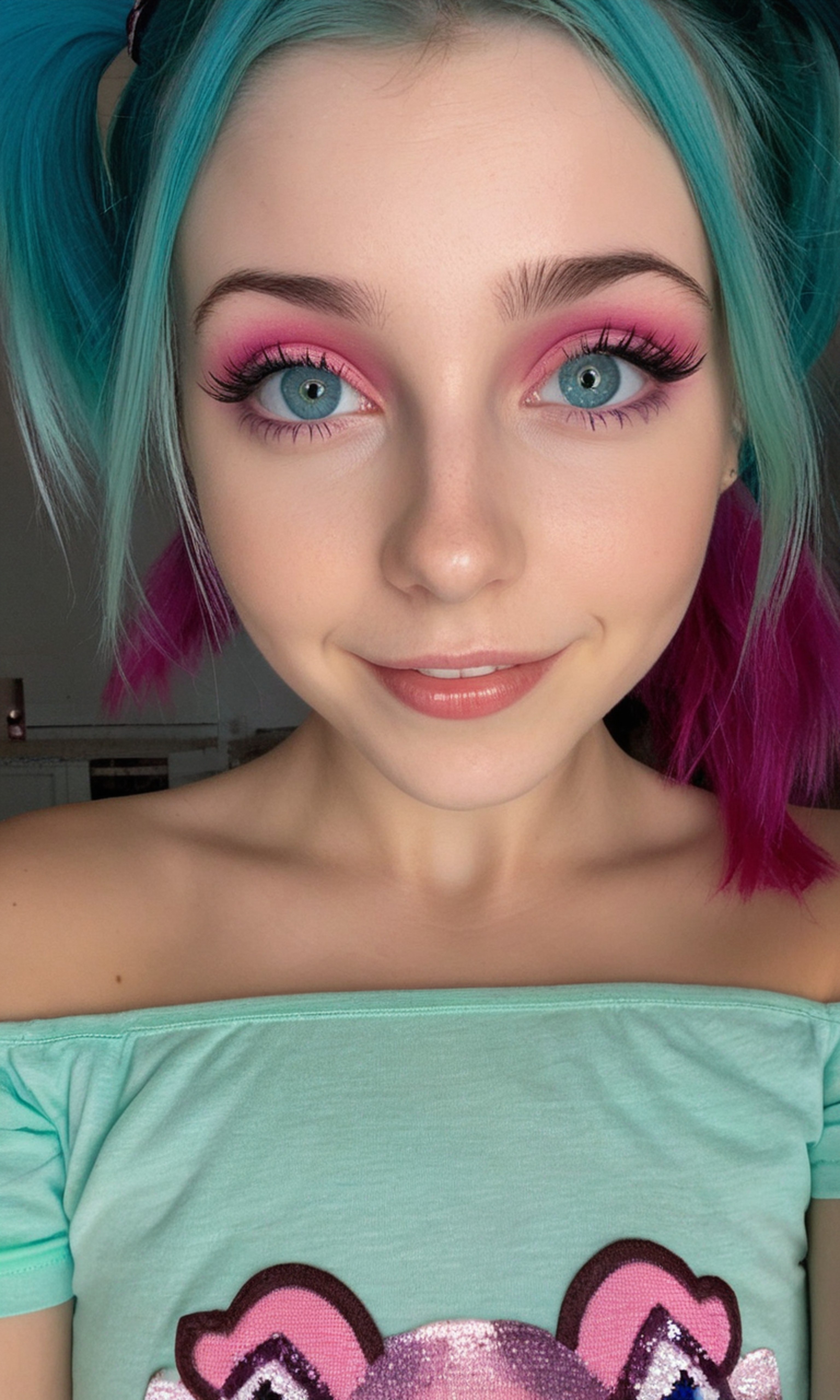 masterpiece, best quality, amazing quality, very aesthetic, high resolution, ultra-detailed, absurdres, 20yo, twintails, cyan and magenta heterochromia eyes, naughty face, closed smile, pink off-shoulder shirt, (cyan hair:1.1), flat chest, looking at viewer