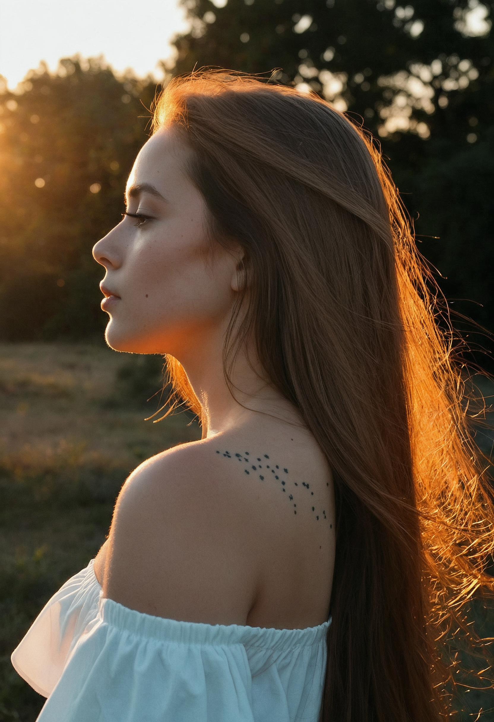 unsplash, A young woman with long, straight, light brown hair flowing down her back stands in profile against a twilight sky. She's wearing a white off-shoulder top, showing a small constellation tattoo on her left shoulder. The soft, natural light from the setting sun casts a gentle glow on her face, highlighting her high cheekbones and full lips. Her skin has a warm, natural tone. The background is a blurred field with a few scattered trees, creating a shallow depth of field that keeps the focus on her. The sky shifts from blue to a warm orange near the horizon. The photo uses the rule of thirds, with her positioned off-center to the right. The mood is chill and contemplative, enhanced by the natural light and the serene landscape.