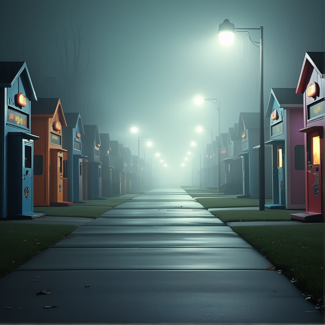 liminal, suburban, depth of field, 4 story buildings, night, street lamp, driveways, arcade cabinets, lineup, 3 houses, architecture, no humans, realistic, a lineup of arcade cabinets along the sides of each sidewalk, adjacent side-by-side route, an intensely creepy and disturbing experience, driveways, sidewalks, lamps, fog,