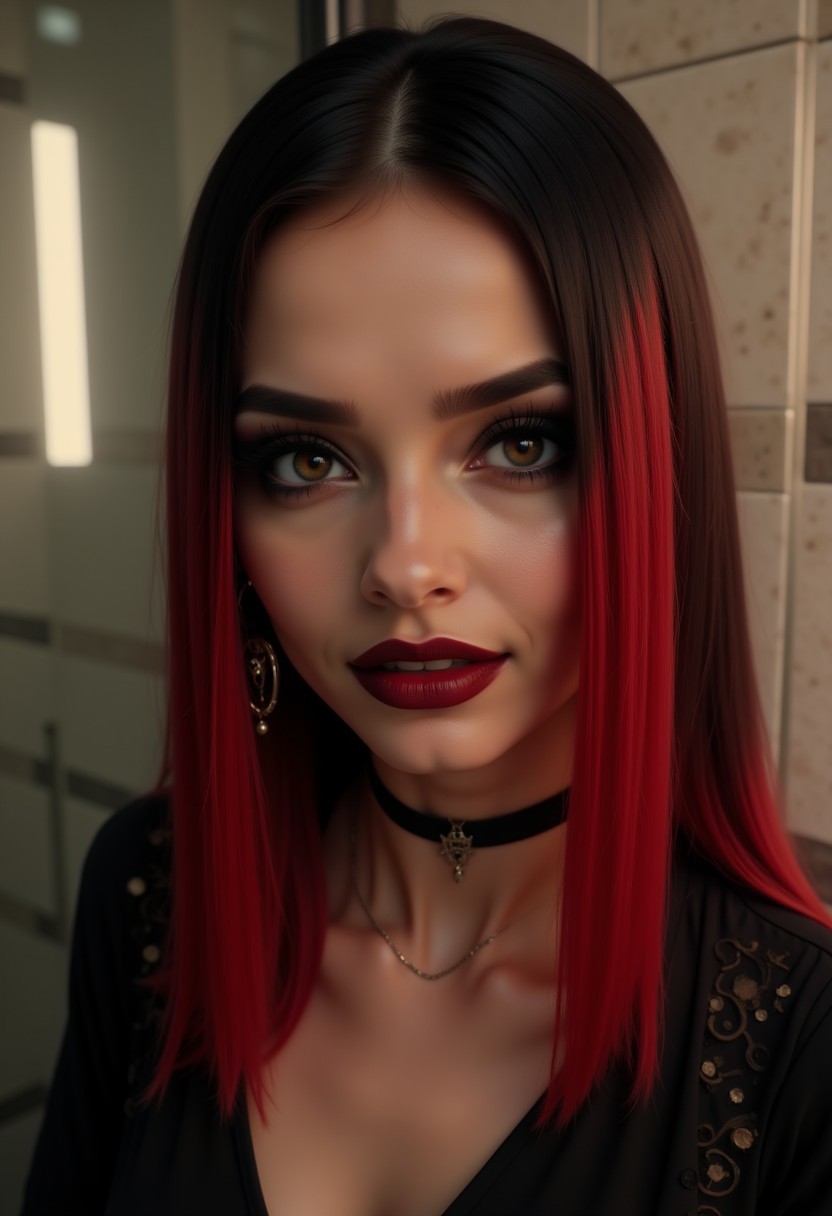 an animated portrait image of (1female) young woman with long straight hair, with vibrant red dyed roots that blend into black at the tips, her face is symmetrical and harmonious, with clear, smooth skin, with striking makeup, she has large, expressive eyes, with thick black eyeliner and an intense gaze, her eyebrows are well-defined and arched, framing her face elegantly, her lips are full and painted in a dark red hue, with a slight enigmatic smile, she wears ringed earrings with a hoop and pentagram design, she wears black clothes with an elegant and alternative style, her expression is confident, mysterious, and seductive, the lighting is soft and diffused, highlighting the features with a realistic and detailed finish with a neutral tile background in a softly lit bathroom, the image has a realistic style with good lighting and sharp details, masterpiece, best quality, amazing quality, very aesthetic, high resolution, detailed eyes, high quality, ultra-detailed, absurdres, newest, scenery, hyper-realistic, professional, moody lighting, golden hour glow, deep shadows, depth of field, 8k, HDR, 3D, best quality, photograph, analog style, real life, extremely beautiful, (highly detailed, intricately detailed), (highly detailed skin), (alluring eyes), deep shadows, depth of field, volumetric lighting, photo realistic, realistic