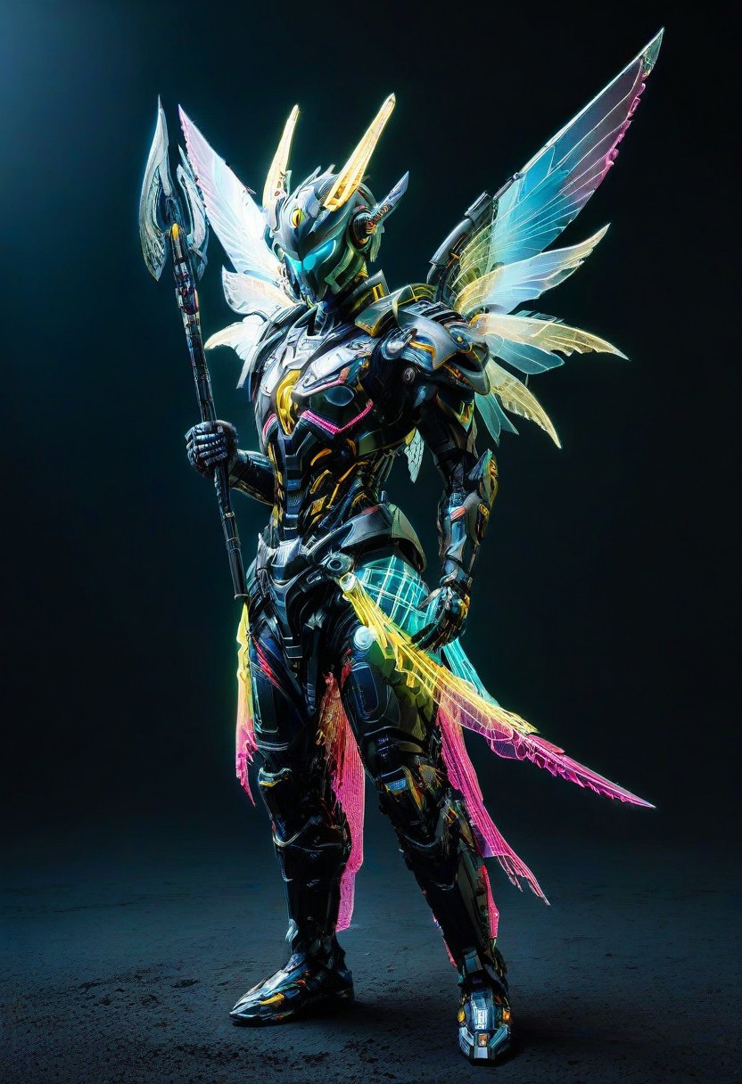 score_9, score_8_up, score_7_up, score_6_up, score_5_up, score_4_up, w0gf1l, vibrant colors, easynegative, dramatic lighting, easynegative, Cyborg made of tiny neon glass filaments, cyborg Angel, wings, holding spear and shield, chrome armor, gold highlights, night sky, a glowing futuristic pyramid made of tiny neon glass filaments in the background,