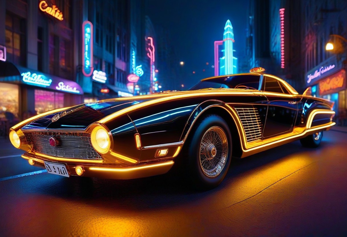 ((50's retrofutursim)), w0gf1l, iconic art style, blend of retro aesthetics and futuristic utopia, futuristic car, futuristic 50's tailfin era car made of tiny neon glass filaments:, highly detailed gold trim, driving through a city of art deco buildings, the city's neon lights brighten the darkness of night,