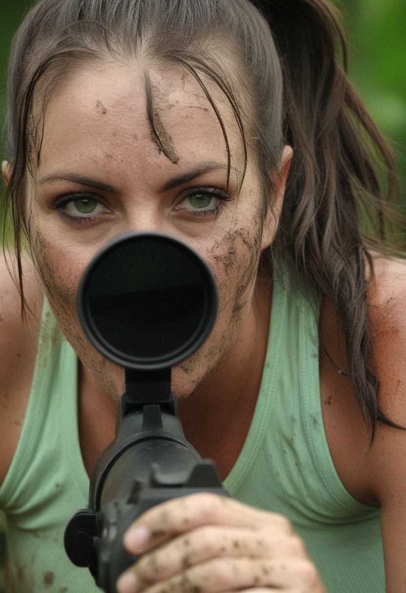 American brunette woman looking into her rifle's scope, 40 yo, wearing green tank top, close up view, close up dramatic, muddy face, muddy body, highly detailed textures, green eyes, 4K, jungle background, pony tail hair, greasy hair