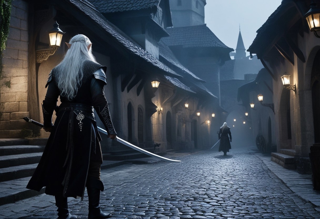 (Highly detailed, hyper-realistic, cinematic, 8K, ultra HD, dramatic lighting, fantasy art, photorealistic, masterpiece, intricate details) In the foreground stands a badly beaten and bruised male elf with long flowing transparent white hair with black streaks. He stumbles down a cobblestone path. At each of his sides are two short swords sheathed in ornate black and silver scabbards, with only their ornate golden handles exposed. Green shimmering fireflies sparsely line the air of path, guiding him toward the city a medieval fantasy city in the background is built from white stone, with organic, flowing architecture illuminated by soft silver light from rooftops. Crystals throughout the city emanate a gentle white glow, while heavy shadows darken the streets. The night sky is filled with the vast Milky Way galaxy, suggesting this city once existed on Earth. The streets are empty, adding to the serene, mystical atmosphere. (Cinematic composition, moody lighting, soft glow, atmospheric fog, epic fantasy setting, volumetric light, hyper-detailed environment, intricate textures, dramatic shadows, ultra-sharp focus, depth of field, stunning visual aesthetics, highly immersive scene, award-winning fantasy art style).