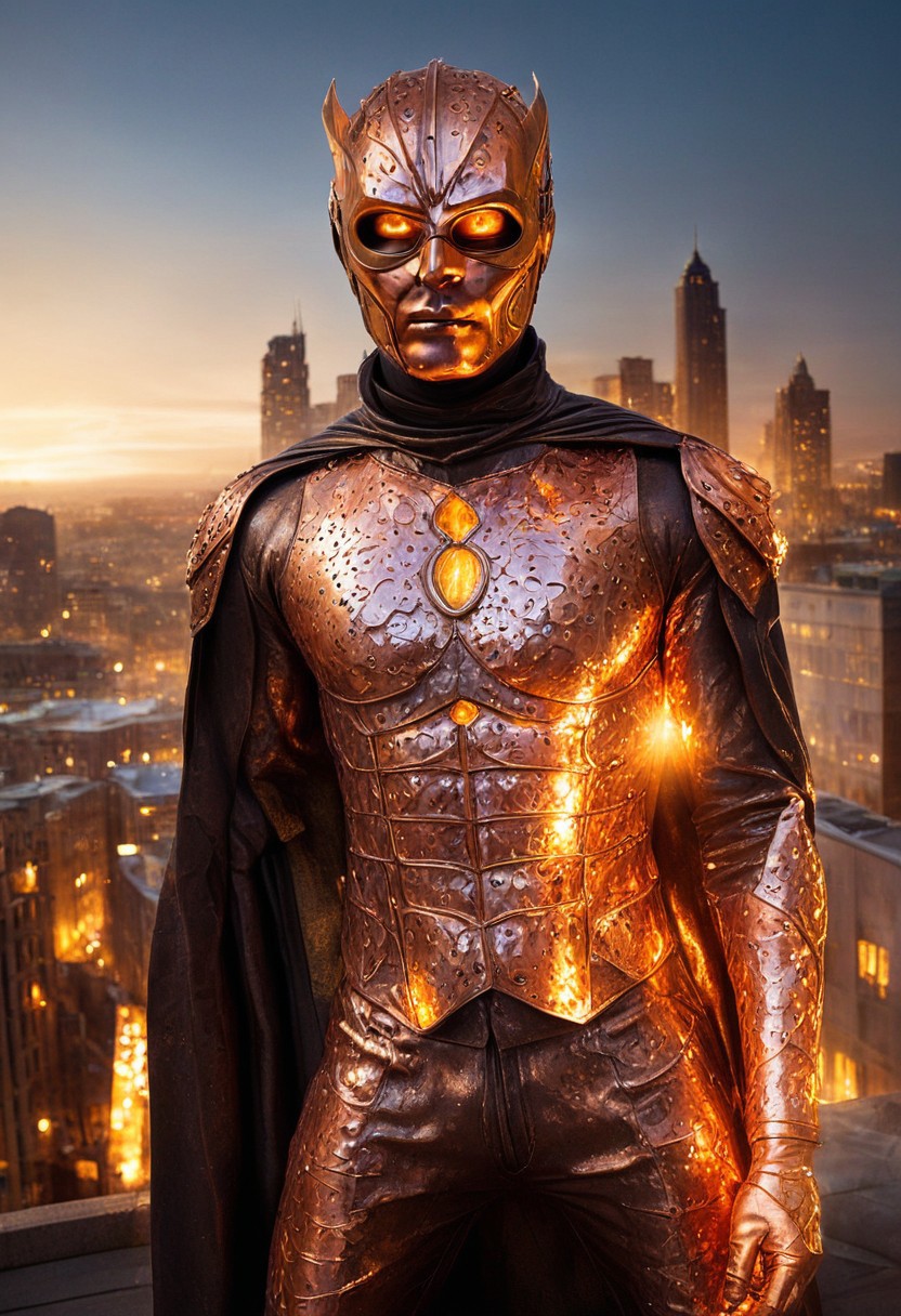 A superhero character made entirely from copper, with a polished metallic body that reflects light in warm amber hues. His armor is sculpted with intricate circuit-like patterns etched into the surface. Glowing orange energy flows through the seams of his body like molten lava. His eyes shine with a soft golden light. He stands heroically on a rooftop at dusk, city lights in the background, cape fluttering in the wind, with a mechanical, steampunk-inspired mask covering his lower face. The atmosphere is dramatic and cinematic.