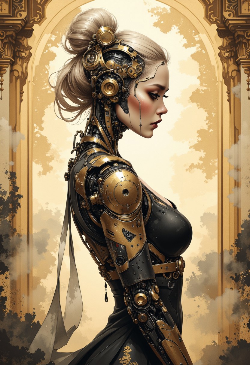 Beautiful female cyborg in the style of marilyn monroe Wild platinum-blonde Futuristic and Vintage stylized extraordinarily beautiful, babe, , modern girl with tattoos dressing vintage, 1920s style clothing , imaginatively 20's stylized dress, , magical, alluring, sultry, full-length, female-body, hazel-eyes, eye catching, bright, , Magical beautiful background fantasy, perfect face and eyes, hyper-detailed hypermaximalist dynamic style AliceWaifu, , skin texture style, realism, detailed, Slender shapely female-body glowing sheer silky Dramatic lighting Cinematic Epic composition Magical background ArsMJStyle, Zen Ink Wash Sumi-e bo-golden White background reij-cybersteam, steampunk, asian, cyberfuturistic, futuristic steampunk, robotic elegance, mechanical aesthetic, cyberdoll details, dim lighting, bokeh effect, asian architecture cyberpunk