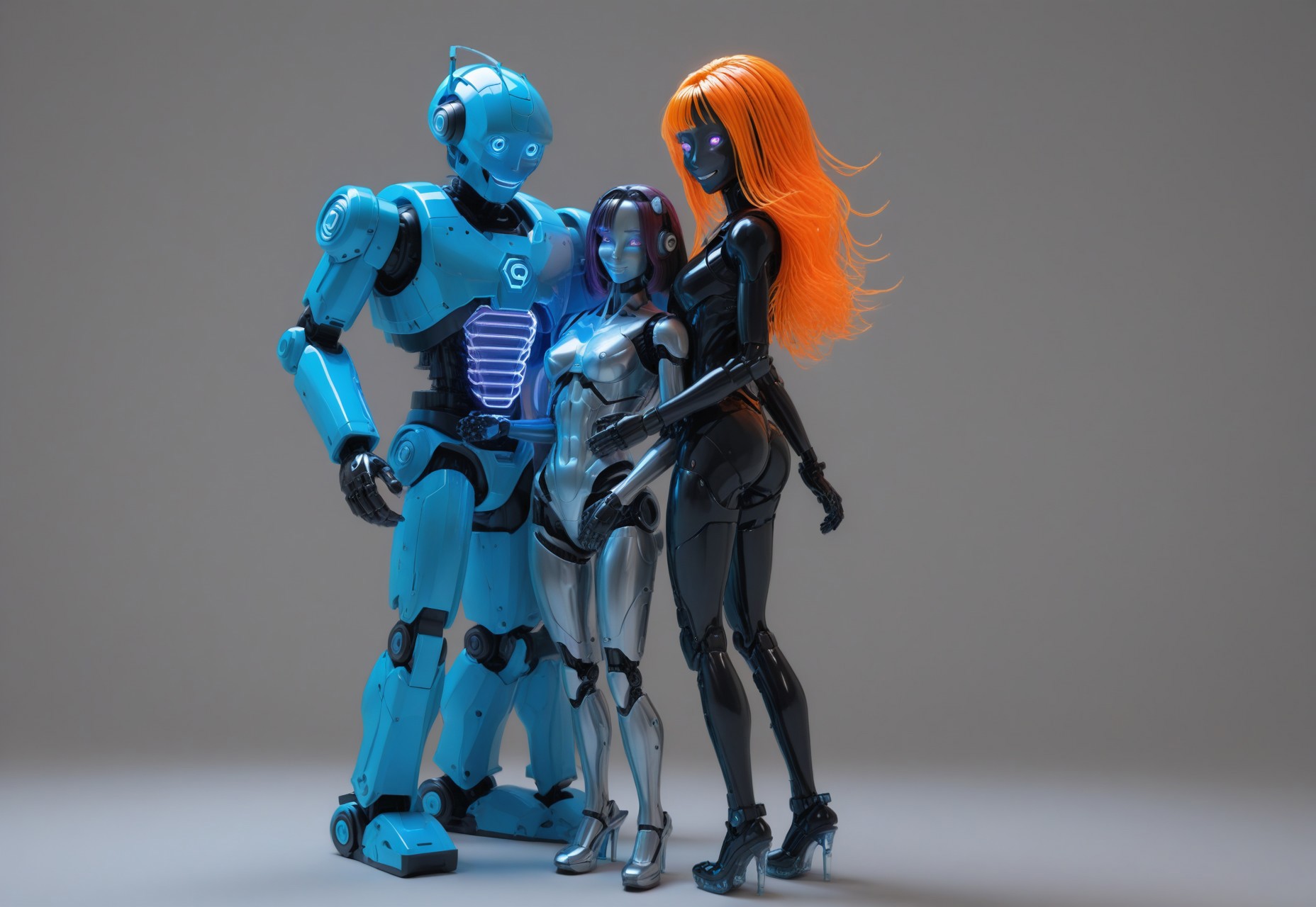 (3 diffrents characters:2), best quality, good quality, very awa, very aesthetic, absurdres, newest, group, group shot, expressing love, hugging, CivBot, CivChan and civitchan holding together, 3 people hugging together, 2girls, and 1robot, (Ombre color scheme of neon blue,neon light orange ,neon orange ) made of, tiny neon glass filaments, w0gf1l:0.81, Manga style, detailed hyperrealism, full-body automaton (CivBot, blue robot), Civitai Logo medallion, head tilted, very high contrast, overhead lighting, 3D rendering, 4, smiling, holographic text:"BUZZ" coins floating around, First character : CivChan, purple eyes, pink hair made of filaments, short hair, Second character : CivBot, civitchan, blue yes, black long hair made of filaments, body made of filaments, Third character : android, bot, Background:cyber bedroom,