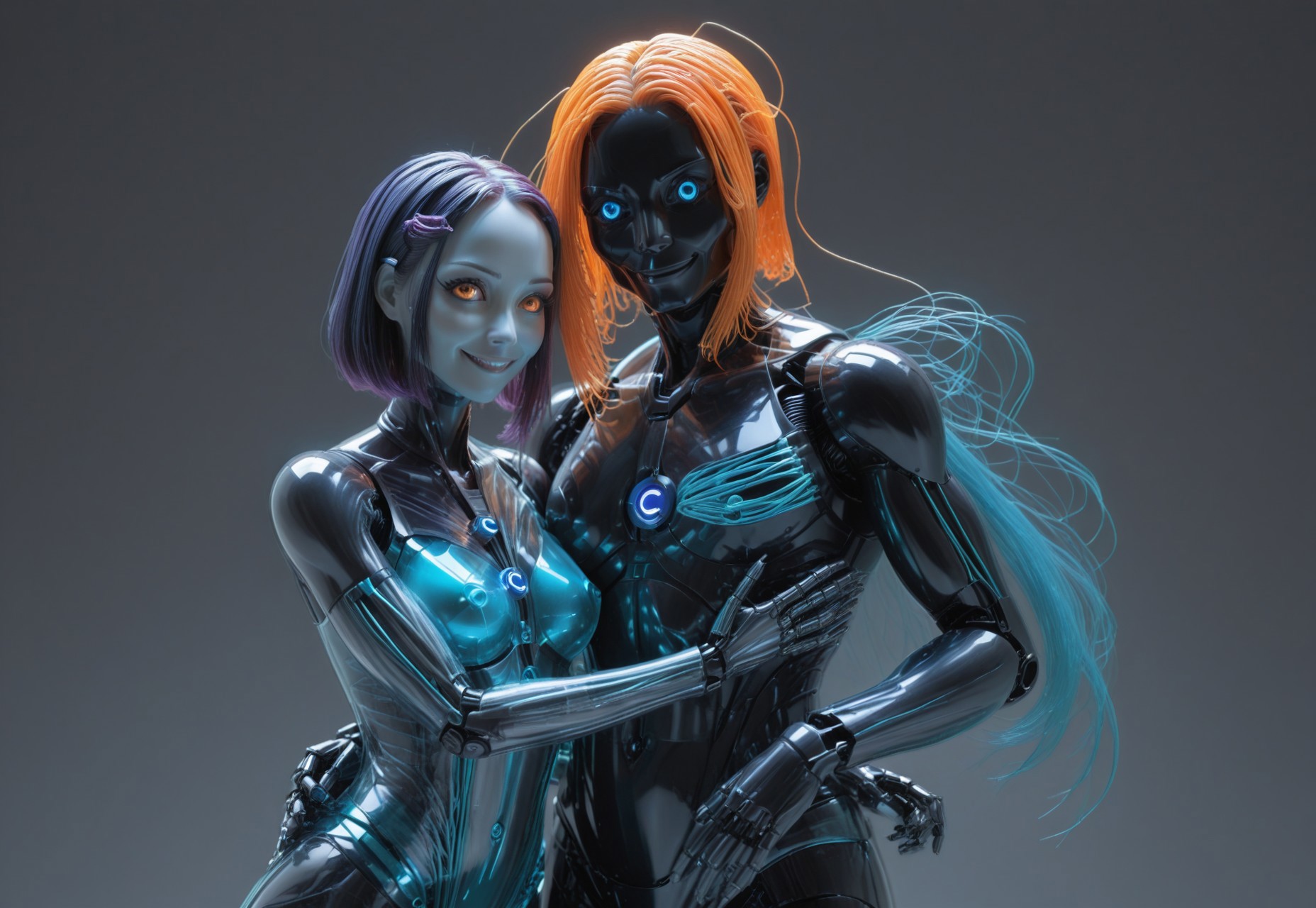 (3 diffrents characters:2), best quality, good quality, very awa, very aesthetic, absurdres, newest, group, group shot, expressing love, hugging, holding together, 3 people hugging together, 2girls, and 1robot, (Ombre color scheme of neon blue,neon light orange ,neon orange ) made of, tiny neon glass filaments, w0gf1l:0.81, detailed hyperrealism, full-body, Civitai Logo medallion, head tilted, very high contrast, overhead lighting, 3D rendering, smiling, holographic text:"BUZZ" coins floating around, First character : CivChan, purple eyes, pink hair made of filaments, short hair, Second character : CivBot, civitchan, blue yes, black long hair made of filaments, body made of filaments, Third character : android, bot, Background:cyber bedroom,