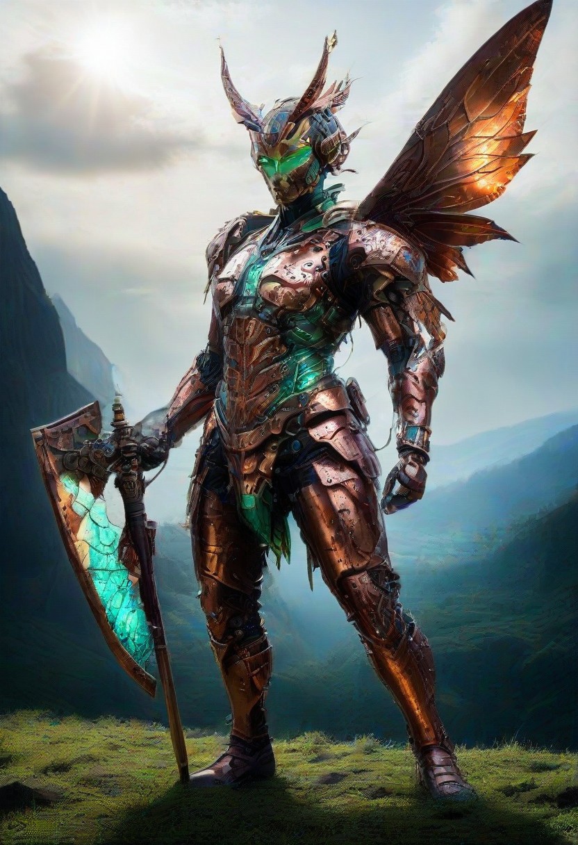 score_9, score_8_up, score_7_up, score_6_up, score_5_up, score_4_up, vibrant colors, easynegative, dramatic lighting, easynegative, Cyborg made of copper, cyborg Angel, copper wings green from oxidation, holding spear and shield, copper armor, chrome highlights, bright sun, blue sky, clouds,