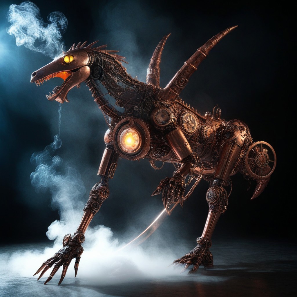 massive copper clockwork beast, intricate gears and metal plates, glowing copper accents across its body, steam rising from various joints, mechanical legs with sharp claws, hovering in the air with a mystical aura, detailed steampunk design, anime-inspired character design with realistic copper textures, dynamic action pose, dramatic lighting highlighting its polished copper surface, fog and shadows enhancing the atmosphere, magical glowing lights illuminating from within