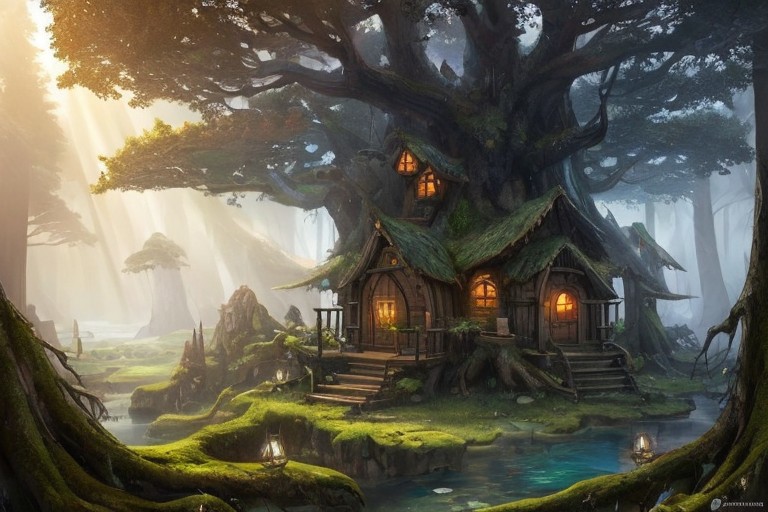 (masterpiece:1.2), (best quality,:1.2), 8k, HDR, ultra detailed, ((photorealistic)), professional light, cinematic lighting, ambient lighting, fantasy, background, volumetric light, tiny cabins, ice crystals BREAK a house on a huge tree in the middle of a forest, fantasy forest, epiCPhoto, FanLan