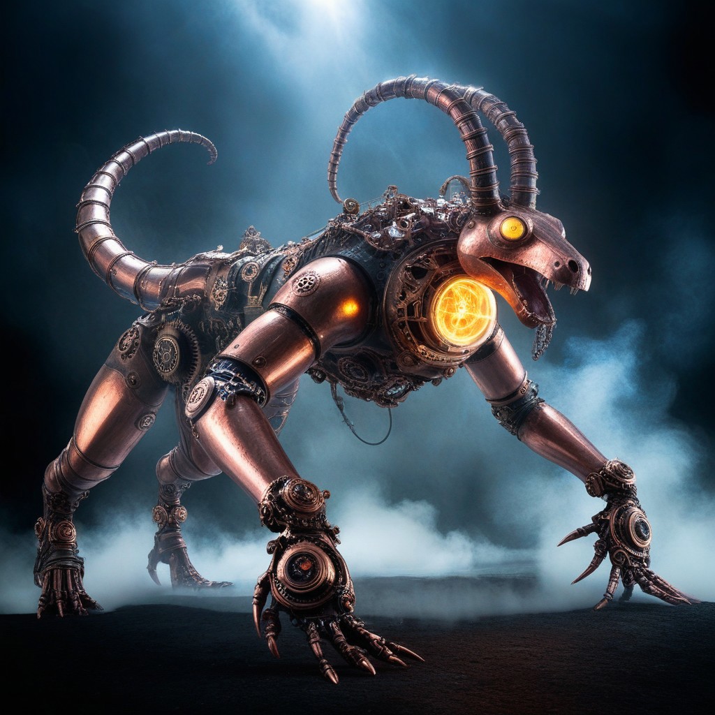 massive copper clockwork beast, intricate gears and metal plates, glowing copper accents across its body, steam rising from various joints, mechanical legs with sharp claws, hovering in the air with a mystical aura, detailed steampunk design, anime-inspired character design with realistic copper textures, dynamic action pose, dramatic lighting highlighting its polished copper surface, fog and shadows enhancing the atmosphere, magical glowing lights illuminating from within