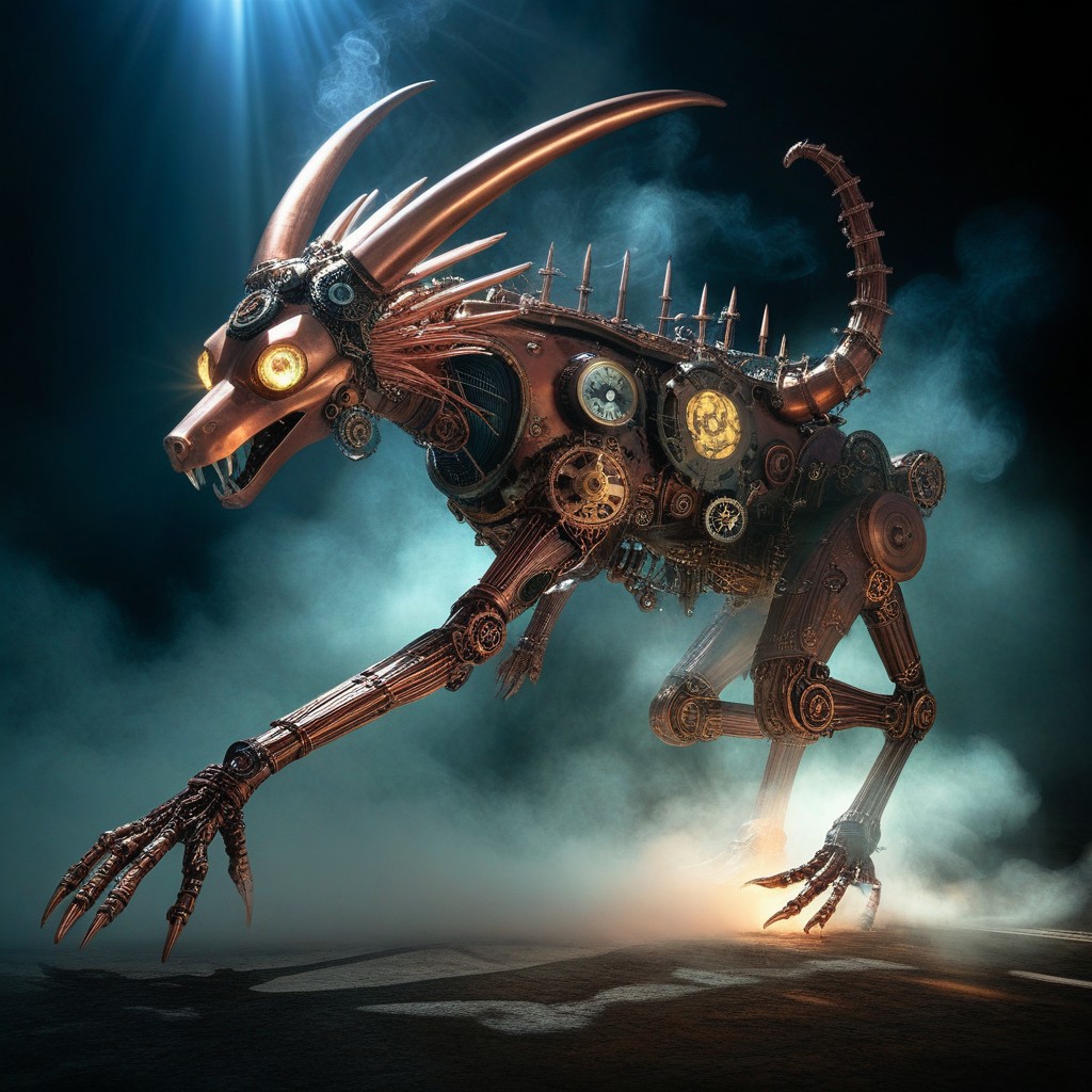 massive copper clockwork beast, intricate gears and metal plates, glowing copper accents across its body, steam rising from various joints, mechanical legs with sharp claws, hovering in the air with a mystical aura, detailed steampunk design, anime-inspired character design with realistic copper textures, dynamic action pose, dramatic lighting highlighting its polished copper surface, fog and shadows enhancing the atmosphere, magical glowing lights illuminating from within