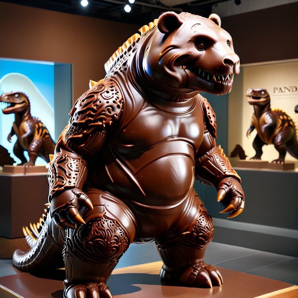 Made of chocolate,A brown and black panda made of chocolate, wearing full-body tyrannosaurus costume at the museum, detailed costume, tyrannosaurus shape costume, brown costume, realistic wood textures, dynamic pose, vibrant colors, detailed environment, museum ambiance, panda at the museum