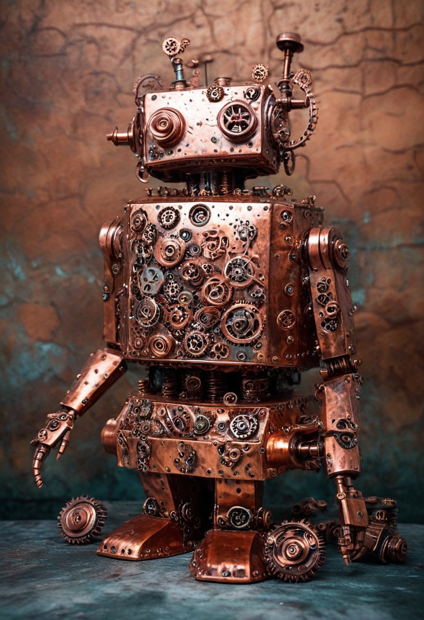 masterpiece, best quality, absurdres, cute copper gear robot tea party, made out of copper gears, made out of copper, copper texture