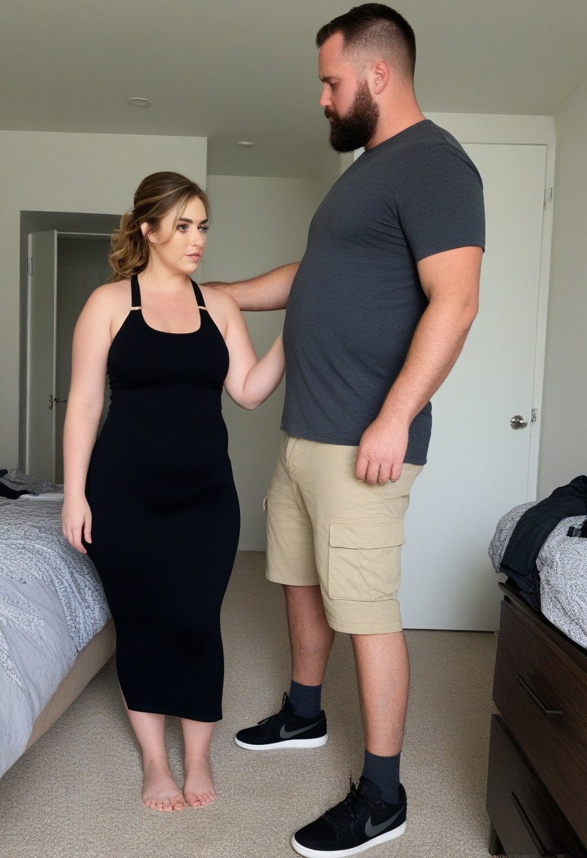 a (fully clothed:1.4) 26 year old white girl standing in a (messy bedroom:1.4) and looking down at floor while she puts her hair in a pony tail wearing a long form fitting (black maxi dress:1.4) which accentuates her body, (no shoes:1.2) girl is 5'9" tall with a natural thick and chubby body, with pale skin, dull wavy dark black hair with, small boobs, slim waist, wide hips, thick thighs, naturally big butt has on black eye shadow, black eye liner, and long fake eyelashes side angle pov capturing the right side of the girl, 1girl, 1guy 30 year old chubby guy standing next to girl's side, looking at camera, slightly taller than girl, brown hair, blue eyes, trimmed beard, wearing gray shirt, khaki cargo shorts, black nike basketball socks, and black shoes guy has his arm around girl, touching her butt