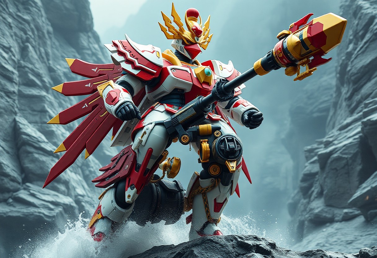 "Create a high-definition, hyper-detailed image of a Full Armor Ogre riding an Ancient Gear Drill, using a red, white, and gold color scheme, inspired by 1992 Japanese design, including a second eagle head with red lips, a palm body, and a captain hat. The setting is season 3 (1997), with influence from Zerator and a right side key light. The image should be listing-worthy and show the high evolution of Bandai's designs. Incorporate elements of a security guard or yeoman, with a nod to Y2K and neo-militarism."