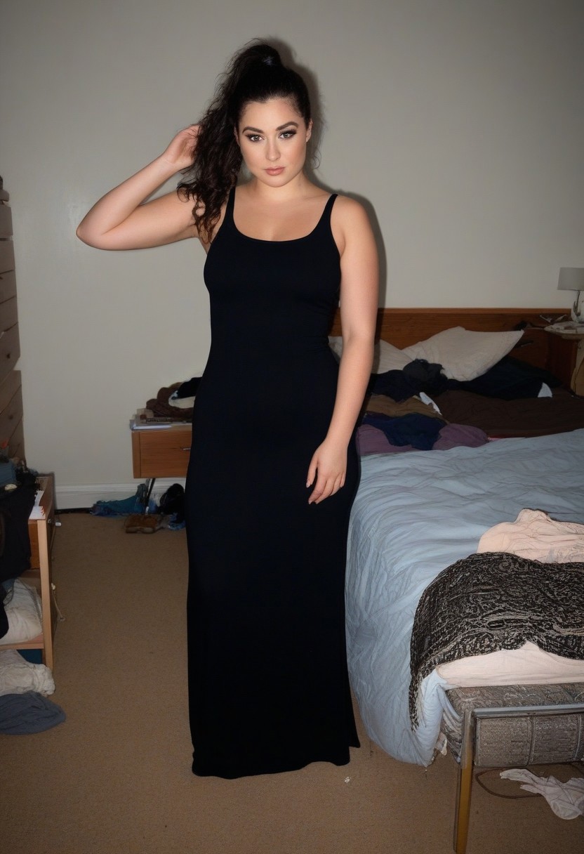a (fully clothed:1.4) 26 year old white girl standing in a (messy college bedroom:1.4) and looking at the camera floor while she puts her hair in a pony tail wearing a form fitting (black maxi dress:1.4) which accentuates her body girl is 5'9" tall with a natural thick body, with pale skin, dull wavy dark black hair with, small boobs, slim waist, wide hips, thick thighs, naturally big butt has on black eye shadow, black eye liner, and long fake eyelashes frontal pov that still captures the girls butt from the side
