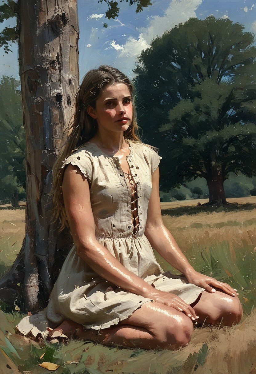 oil painting,highly detailed and realistic art style with expressive, bold brushstrokes, portrait, outdoor, fields,natural light, dynamic composition, sensual position, pretty slender girl,25 years old, farmer sitting on grass against tree oak,dappled light due to leaves of tree oak, (a fabric in her hair covers her hair), period 1450, seen from the middle, stomach to face, she wears a linen dress laced at the front, the loose lacing reveals skin, her cheeks are rosy from the heat, full lips, strands of brown hair stuck to her face by sweat, parted lips, looking at viewer, dappled light on face, big trees and sky behind, natural beauty,