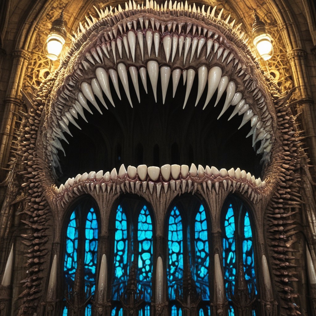 towering biomechanical cathedral constructed entirely from polished and jagged teeth, made_from_teef, gothic arches twisted into rows of molars and fangs, biomech stained glass with enamel shimmer, warm copper undertones in tooth-root spires, surreal lighting with glowing red and blue nerve threads pulsing through the structure, floating tooth halos orbiting the top, teeth chandeliers glowing with inner light, epic fantasy horror surrealism, cinematic shadows, hyperdetailed organic-mechanical fusion, wide angle, dynamic composition