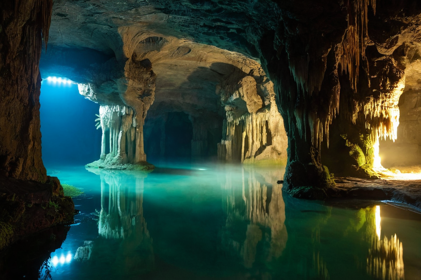 Masterpiece, score_9, score_8_up, score_7_up, highly detailed, surreal, liminal space, underground cave oasis, vast cavern, massive stalactites and stalagmites, artificial lighting, dim fluorescent glow, abandoned yet pristine, underground lake, still water, soft ripples, glowing bioluminescent moss, eerie fog hovering above water, scattered palm trees growing from stone, ethereal reflections, unnatural symmetry, dreamlike, tiled walls partly submerged, ancient forgotten architecture, decayed walkways, faint mist, distant echoes, blue and green neon reflections on water, unseen exit, mysterious ambiance, photorealistic, cinematic lighting, SCP aesthetic, isolation, lost and forgotten world, soft eerie glow <lora:add-detail-xl:1>