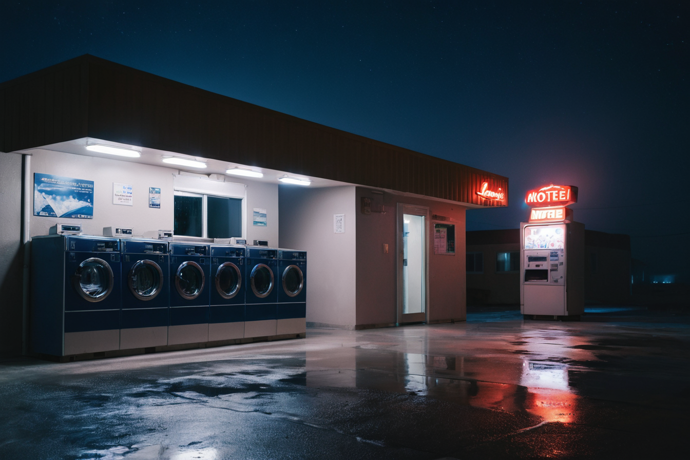 score_9, score_8_up, score_7_up, rating_safe, source_anime, digital art, photo-realistic, liminal space, night scene, eerie atmosphere, solo, empty laundromat, washateria interior, glowing fluorescent lights, reflections on linoleum floor, coin machines, vending machine dimly lit, distant hum, slightly flickering ceiling light, motel in background through large window, glowing neon motel sign, deep blue night sky, subtle fog, wet pavement outside, isolated setting, nostalgic, dreamlike, cinematic, analog photography aesthetic, subtle film grain, soft shadows, warm interior glow contrasting with cold exterior <lora:add-detail-xl:1>