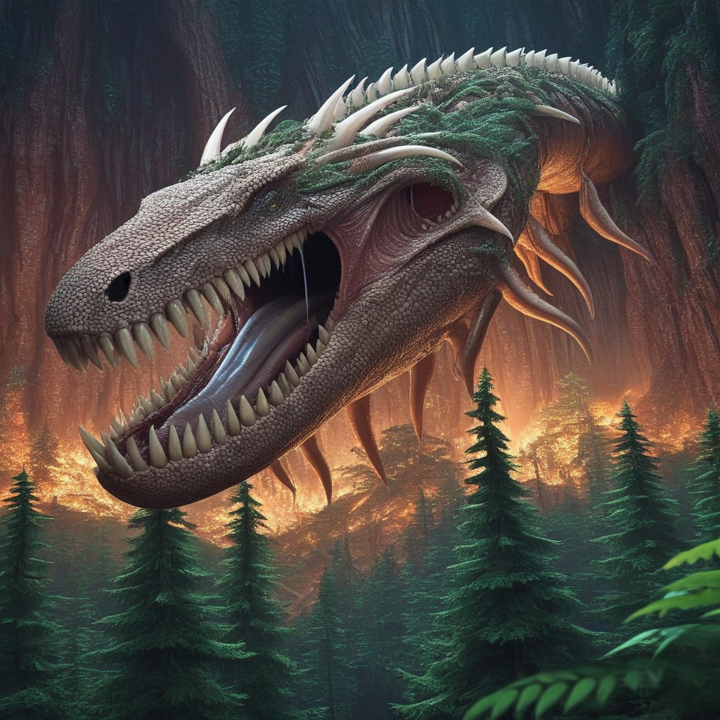 colossal leviathan creature slithering through a jungle made entirely of teeth, tusk-like trees spiraling into the sky, made_from_teef, the monster’s scales formed of interlocked canines and molars, vines of dental nerves hanging from massive premolar cliffs, glowing copper mist drifting through forest, surreal and alien aesthetic, anime style with cinematic horror fantasy atmosphere, aerial view, vibrant colors with enamel gloss and gum-colored bioluminescence, 32k texture, hyperdetailed