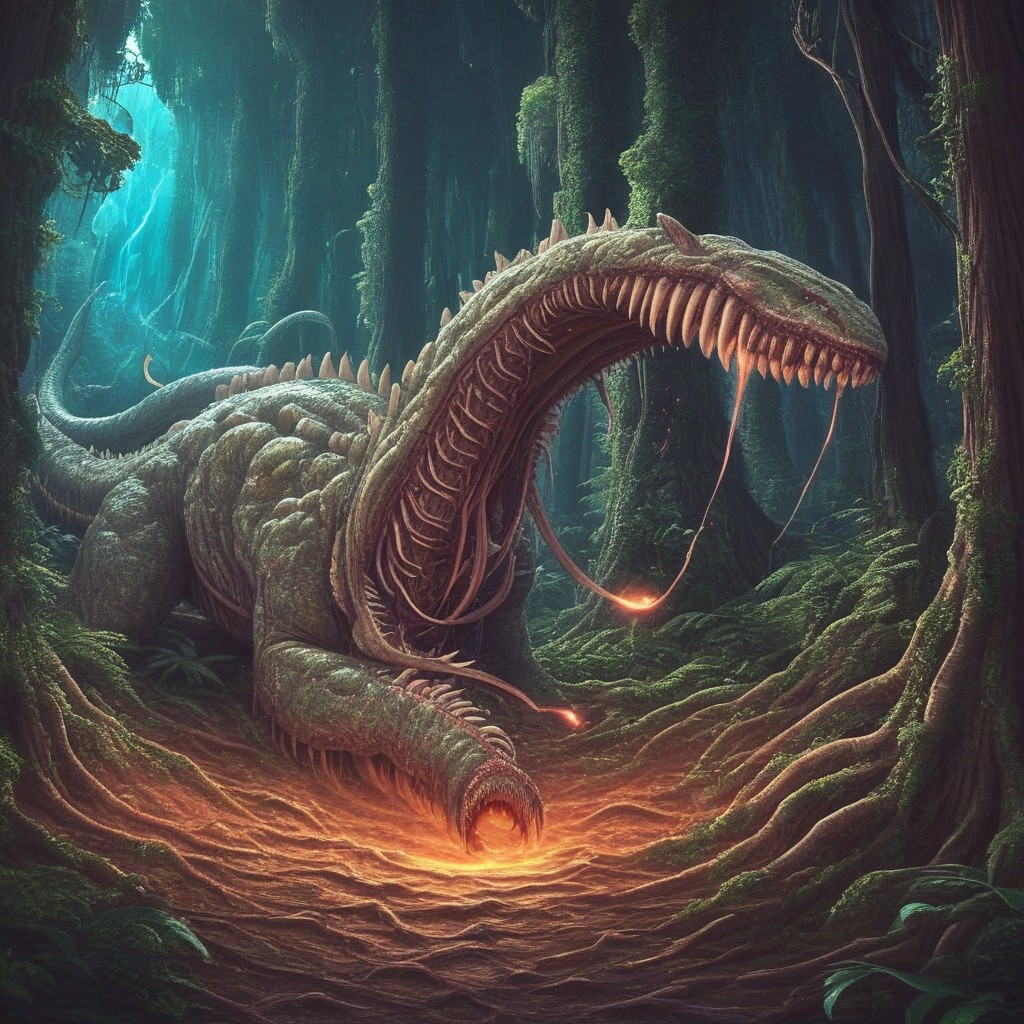 colossal leviathan creature slithering through a jungle made entirely of teeth, tusk-like trees spiraling into the sky, made_from_teef, the monster’s scales formed of interlocked canines and molars, vines of dental nerves hanging from massive premolar cliffs, glowing copper mist drifting through forest, surreal and alien aesthetic, anime style with cinematic horror fantasy atmosphere, aerial view, vibrant colors with enamel gloss and gum-colored bioluminescence, 32k texture, hyperdetailed