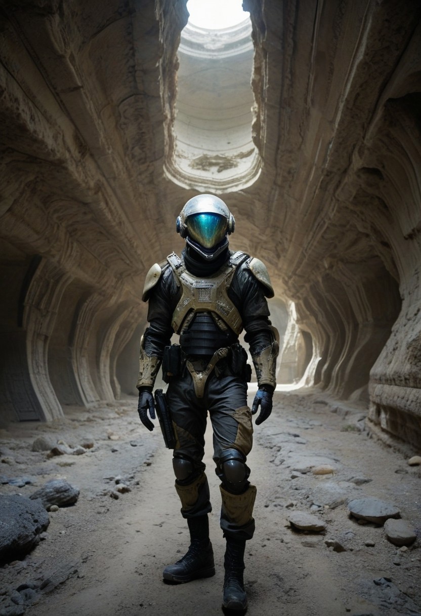 ((marching)), three quarters view, Stone catacombs in an alien world . Alien stone military tank, fissures on skin ((((Full body portrait))))