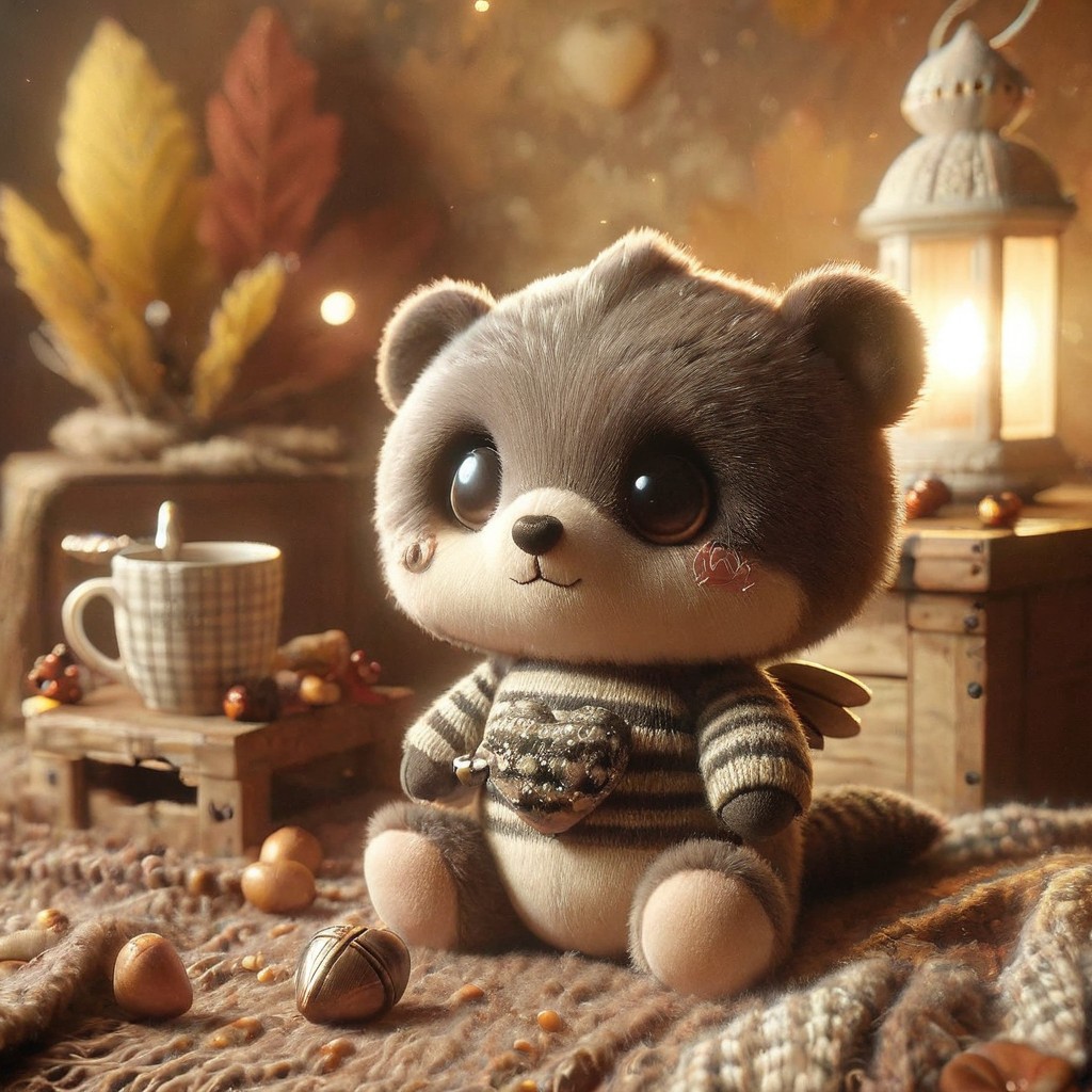A soft toy badger with a round face, big shiny bead-like eyes, and fluffy cheeks. Its back is covered in gray-and-white stripes, while the tummy is a cozy beige, like plush fabric. The badger wears a cute knitted sweater with a braid pattern and tiny wooden buttons. In one paw, it holds a small lantern with warm yellow light, and in the other — a bee-shaped magnet (symbolizing hard work). The insides of its ears are slightly pink, and its tail is fluffy with a dark tip. It sits on a wooden chest carved with leaf patterns, surrounded by autumn-themed items: scattered acorns, a checkered blanket, and a mug of steaming cocoa. The background features warm tones—ochre, soft brown, and cream. The style is realistic 3D illustration with emphasis on textures (fur, knitted wool, wood) to make it look touchable. Its expression is kind and slightly shy, as if the badger wants to be friends.