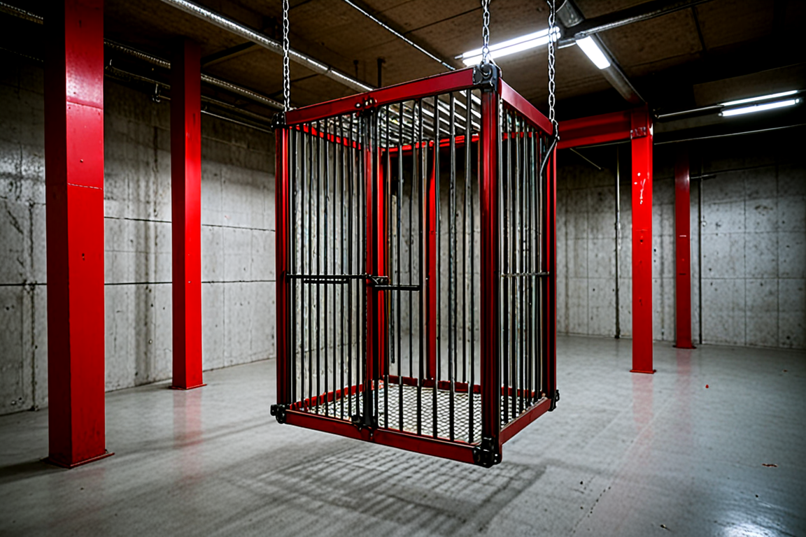 <lora:pytorch_lora_weights_361535:1>,Industrial fetish hall with exposed steel beams, iron-bar cage, a modernized pillory made of polished chrome, suspended hook chains, mood lighting in red and blue tones, and reinforced concrete floor marked with scuff and burn textures,
