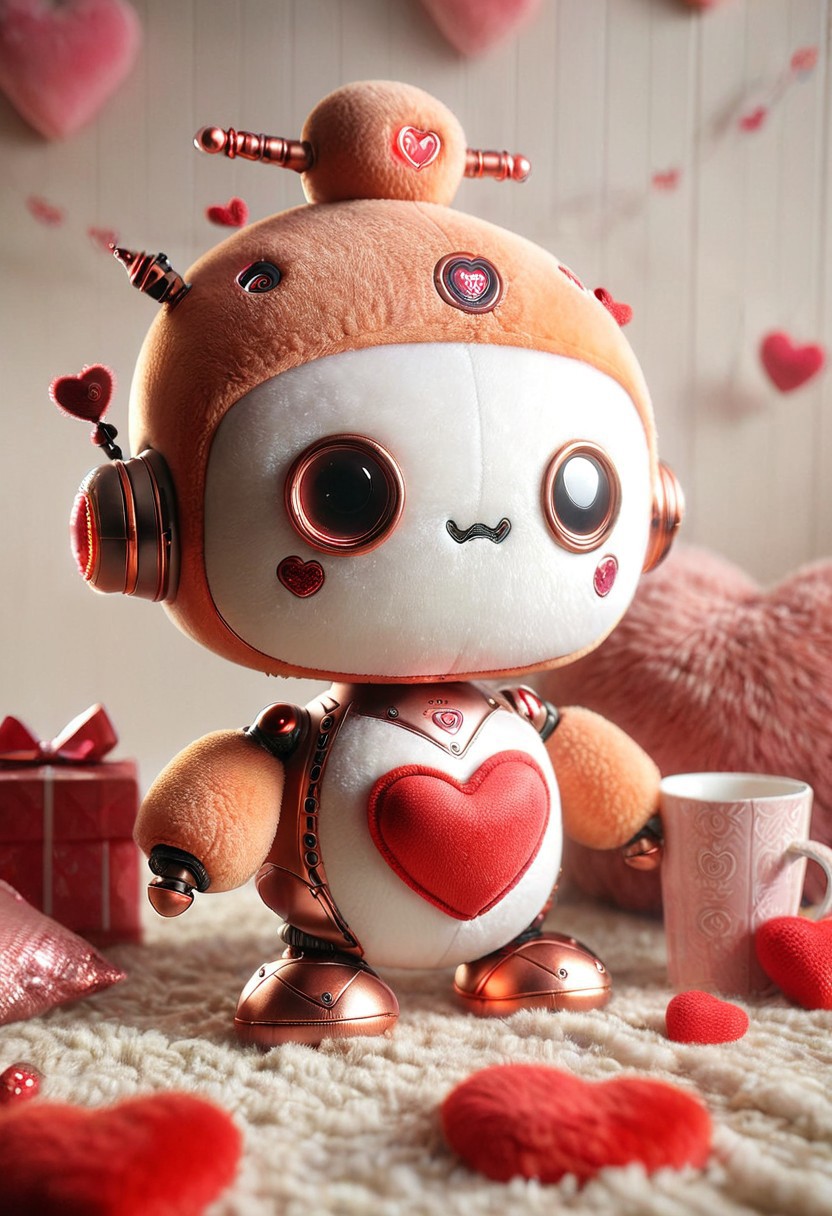 masterpiece, best quality, absurdres, cute copper gear robot tea party made out of plush, ral-smlvltnpls, all plush